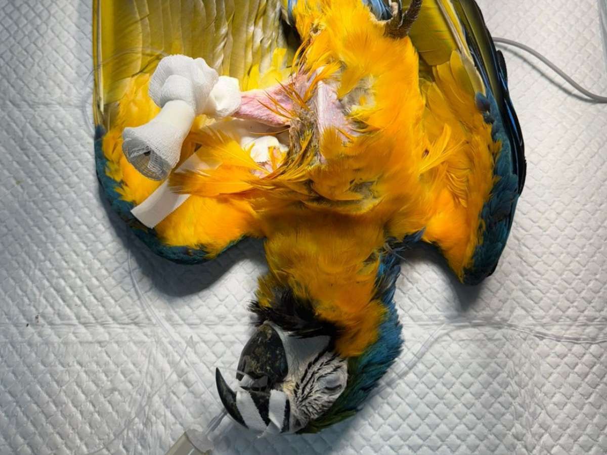 A arara foi resgatada na semana anterior por membros do Cefau enquanto faziam monitoramentos na região e perceberam dificuldades de locomoção e sinais de automutilação no membro pélvico esquerdo.