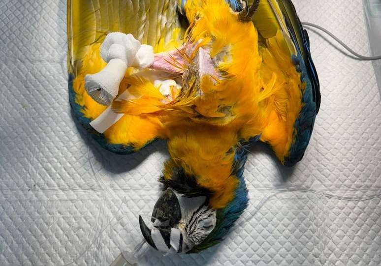 "Antes da intervenção, a arara passou por avaliação clínica que identificou déficit de propriocepção (dificuldade em perceber a posição e o movimento do corpo) e atrofia muscular severa no membro afetado", diz o comunicado da Naturatins.