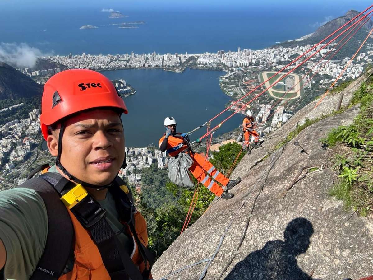 Muitas vezes a gente pega paisagens muito críticas, mas quando pega paisagens bonitas, como o Corcovado, acaba aproveitando um pouco. Mas é um trabalho com risco de queda o tempo todo, tem que ter equipamento, condições físicas e mentais.