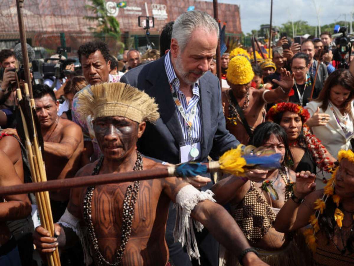 "A ministra dos Povos Indígenas vai conversar com eles. Precisamos ouvi-los, porque eles têm reivindicações legítimas, mas nós temos instituições", disse o embaixador Corrêa do Lago, rodeado por indígenas e a imprensa.