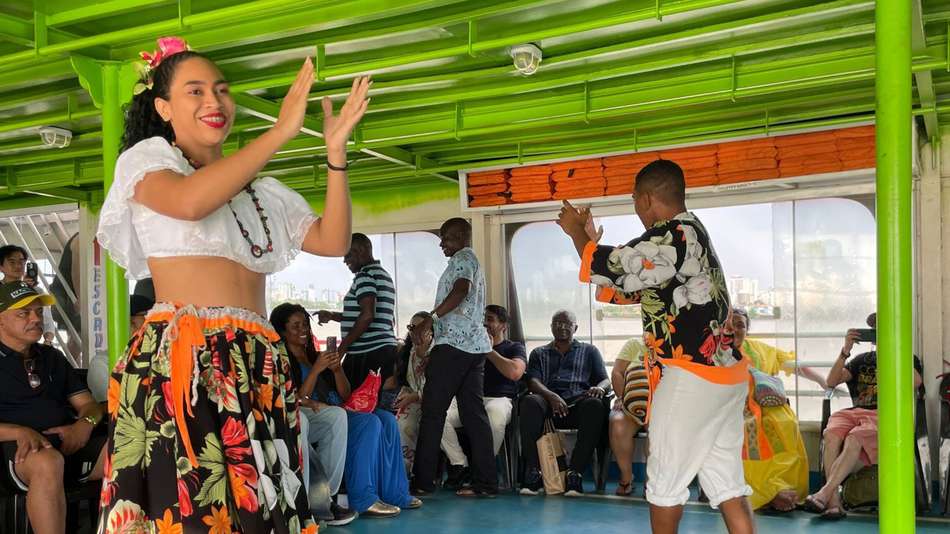 Gringos aprendem carimbó em Belém. Um grupo de estrangeiros se divertiu durante um passeio de barco pelo Rio Guamá. Eles aproveitaram o momento para aprenderem a dança, que é típica da região Norte. Créditos das imagens: Adrielle Farias/Terra *Essa reportagem foi produzida como parte da Climate Change Media Partnership 2025, uma bolsa de jornalismo organizada pela Earth Journalism Network, da Internews, e pelo Stanley Center for Peace and Security.