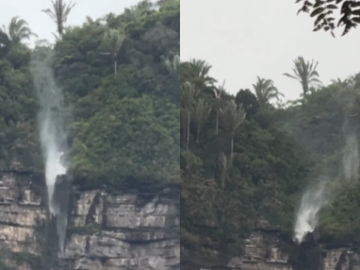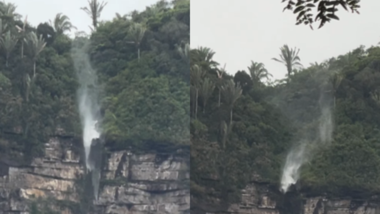 Junior Aguiar compartilhou a curiosidade em seu Instagram. Nos registros, é possível ver que a água da Cachoeira da Murimbeca 'sobe' ao invés de cair. "Como é que pode isso?", questiona uma mulher enquanto o fenômeno é filmado. "Ação do vento", responde o guia.