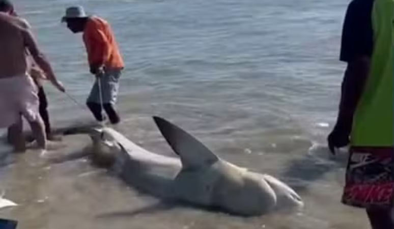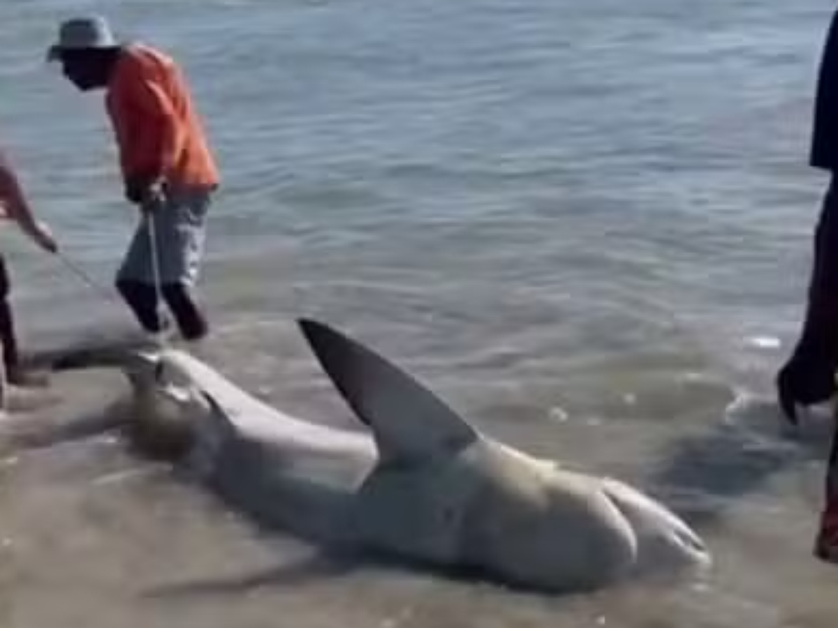 Um tubarão-cabeça-chata foi retirado do mar por um grupo de homens na Praia do Paiva, em Cabo de Santo Agostinho, na Região Metropolitana do Recife (PE), neste domingo, 29. Imagens registram dois homens golpeando as barbatanas do animal com facas, enquanto um deles chega a subir sobre o tubarão para tirar fotos.