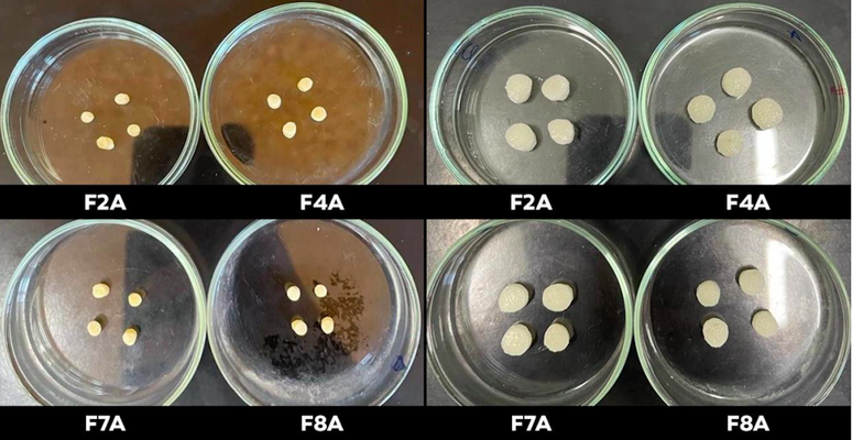 Amostras de hidrogel secos (à esquerda) e após 24 horas em hidratação (à direita). Fonte: acervo pessoal.
