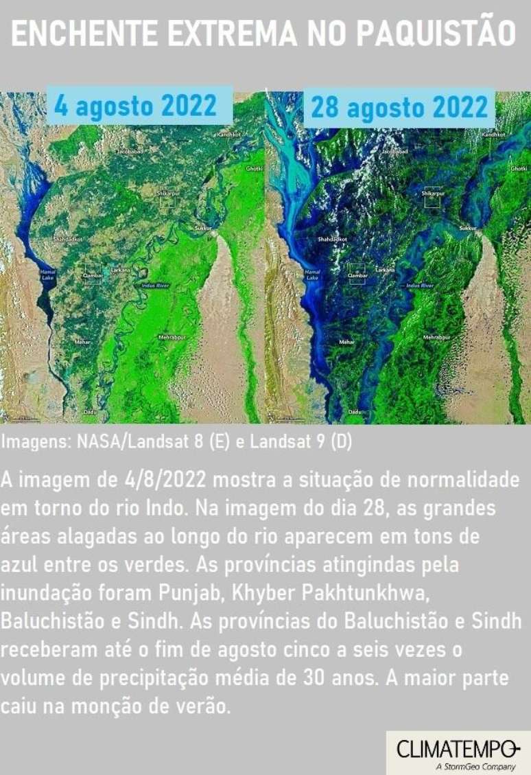Imagens de satélite mostram as severas inundações no sul do Paquistão em agosto de 2022