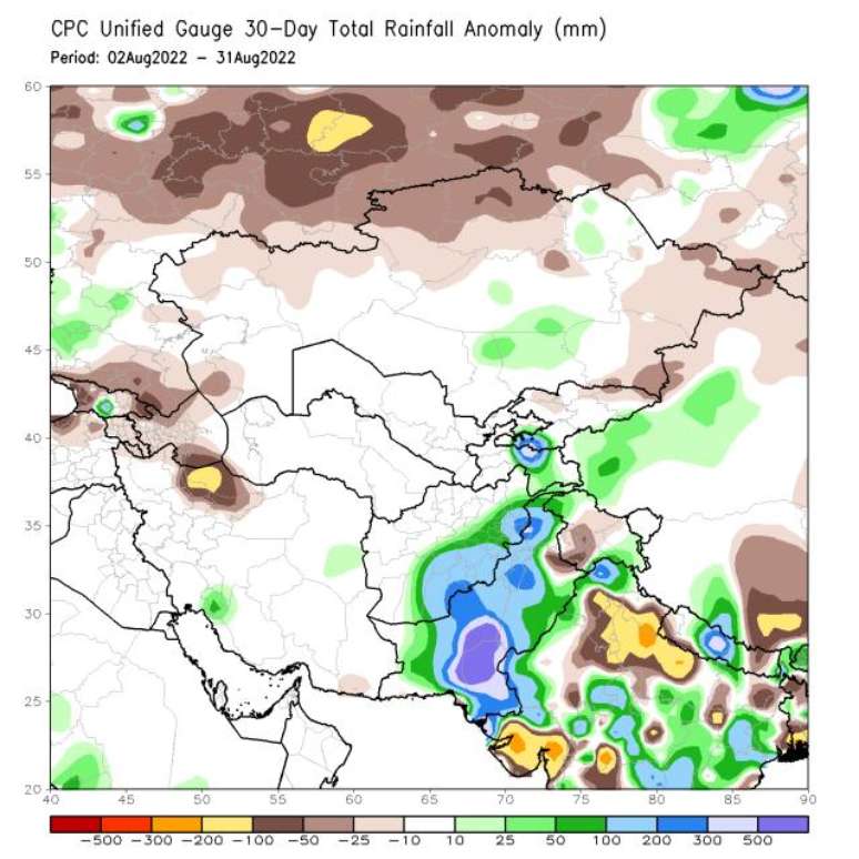 O Paquistão terminou agosto de 2022 em situação de calamidade pública. As chuvas de monções de 2022 têm provocado mortes e destruições, dia após dia, e por meses. O volume de chuva observado dentro deste período de monções ultrapassa em 10 vezes a média climatológica (ou a média dos últimos 30 anos) e em algumas províncias do sul do país.