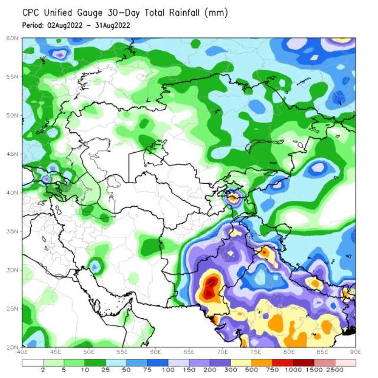 Em agosto deste ano foram mais de 400mm de chuva sobre regiões e províncias do Paquistão, alguns com mais de 600mm e outros acumulando mais de 800mm, como em Sindh, por exemplo. Baluchistão também teve fortes chuvas e inundações, com mais de 300mm acumulados. Alguns locais receberam quatro vezes mais chuva do que o normal para o mês.