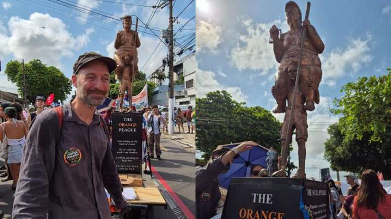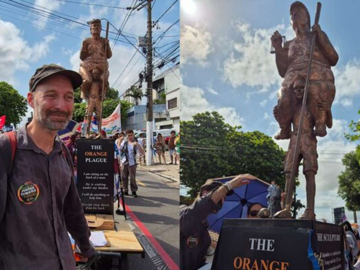Um coletivo de arte dinamarquês expôs durante a marcha uma escultura chamada "A praga laranja", com a imagem do presidente americano, Donald Trump sobre as costas de uma pessoa que afunda sob seu peso.