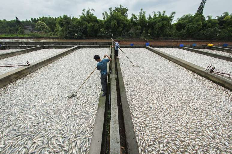 Fazendeiros estão tendo trabalho para recolher peixes mortos no Condado de Xinjin, província de Sichuan, na China, onde mais de 400 toneladas de peixes mortos foram encontradas no sábado. Os animais estão sendo recolhidos de 55 tanques de piscicultura na localidade. Autoridades de proteção ao meio ambiente chinesas afirmaram que não foi descoberta poluição industrial na área, e os peixes morreram devido à insuficiência de oxigênio no rio que banha os viveiros, de acordo com a mídia local.