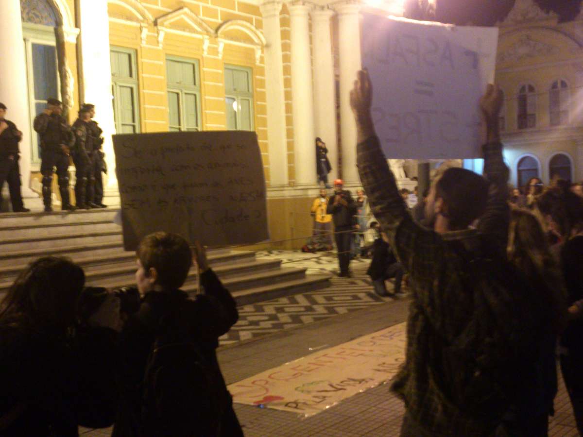 Manifestantes contrários ao corte de árvores na região do Gasômetro, em Porto Alegre, voltaram a protestar nesta quinta-feira, em frente à prefeitura da cidade. A ação está prevista para duplicação de vias na região para a Copa do Mundo. Com cartazes e gritos de ordem, centenas de pessoas compareceram ao local na noite desta quinta-feira. Um manifestante, que preferiu não se identificar, afirma que a prefeitura no máximo propôs replantar cerca de 30 das 115 árvores. "Ou são todas, ou é nenhuma", diz.