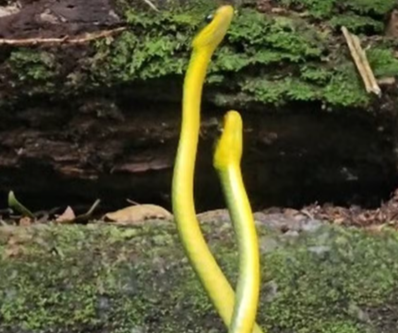 Um visitante do Parque Nacional da Tijuca registrou um momento único entre duas cobras-cipó. Os machos duelavam, numa espécie de dança, para conquistar a fêmea.