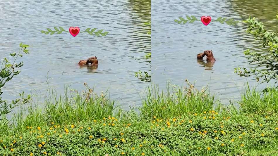 O momento carinhoso foi registrado nesta quarta-feira, 18, por uma aluna no campus da Universidade Federal Rural do Rio de Janeiro (UFRRJ), em Seropédica. “Elas sempre ficam juntas, mas desse jeito é a primeira vez que eu vejo”, explicou Flaviana Finotti ao Terra. O momento atípico de ‘amor’ entre as capivaras pode ser um provável ritual de acasalamento. Reprodução/@flavi.finotti/Instagram