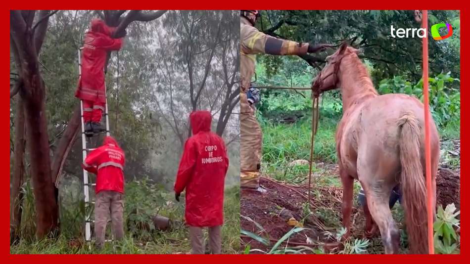 Cavalo é resgatado após cair em bueiro durante chuva em Foz do Iguaçu (PR). As imagens foram publicadas por Carol Dedonatti, que é protetora de animais. "Descobrimos depois que ele passou a noite toda de chuva ali", escreveu ela. De acordo com Carol, o tutor do animal foi autuado por deixá-lo solto no local. O cavalo passa bem após ser salvo pelos bombeiros; a ação levou 2 horas. Reprodução/protetoracaroldedonatti/TikTok