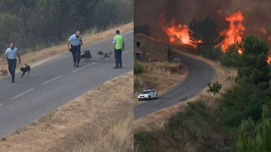 Policiais salvam cachorros durante combate a incêndio florestal em Portugal
