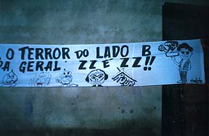 Rio de Janeiro - Cartaz que faz alusão à ocorrência do corredor da morte (sempre dividido em lado "A" e lado "B"), que foi usado como prova da ligação da ZZ Produções com a violência
