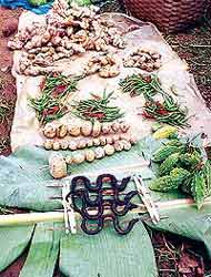 Nos mercados, espetinhos de cobra para os mais famintos.