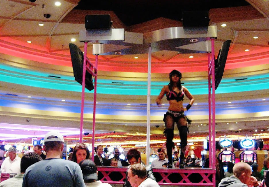 O Flamingo, atualmente o cassino mais antigo da Strip, não tem vergonha de ser brega. Música pop alta, muito neon cor-de-rosa e dançarinas seminuas entretêm os visitantes.Foto: Solly Boussidan / Especial para o Terra