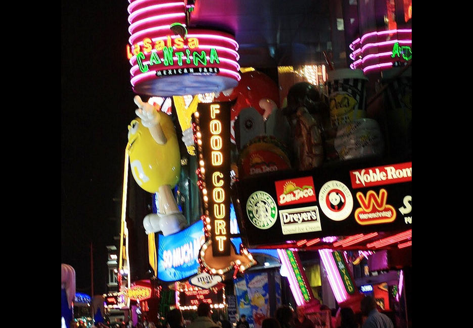 O M&M's World conta com uma infinidade de chocolates da marca, além de um gostoso café com opções de lanches rápidos bem na Strip. Ao seu lado existem diversas opções de cadeias de fast food mais tradicionais.Foto: Solly Boussidan / Especial para o Terra