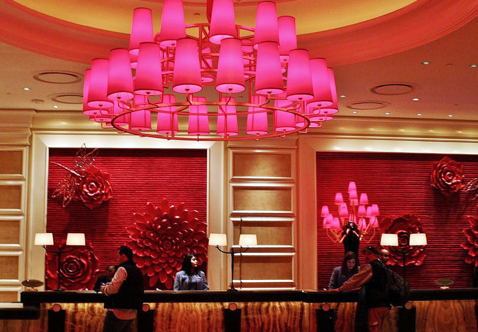 Recepção em estilo oriental do Encore exagera no vermelho, flores gigantes e borboletas. O serviço, no entanto é prestativo e atencioso. Não há custo para maleteiros, valet-parking ou guarda-volumes. Uma gorjeta de no mínimo US$1 por mala, ou de US$ 2 ao se retirar o carro, é de bom tom.Foto: Solly Boussidan / Especial para o Terra