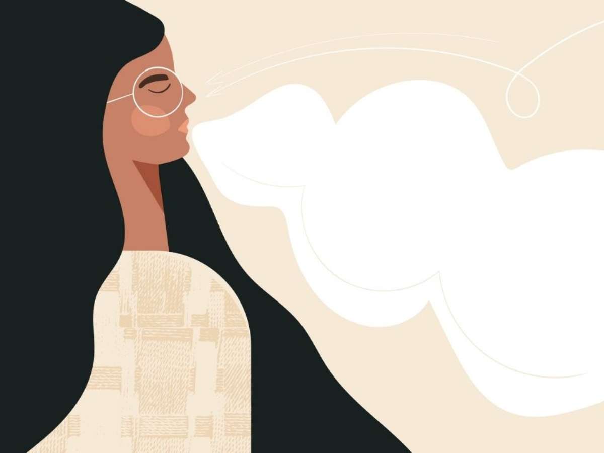 Puxe o ar bem forte até encher o pulmão completamente e solte até esvaziar por completo. Faça o mesmo, mas agora em dois tempos: puxe o ar bem forte em dois tempos e solte em dois tempos. Puxe o ar profundamente e segure a respiração por 8 segundos, depois solte.