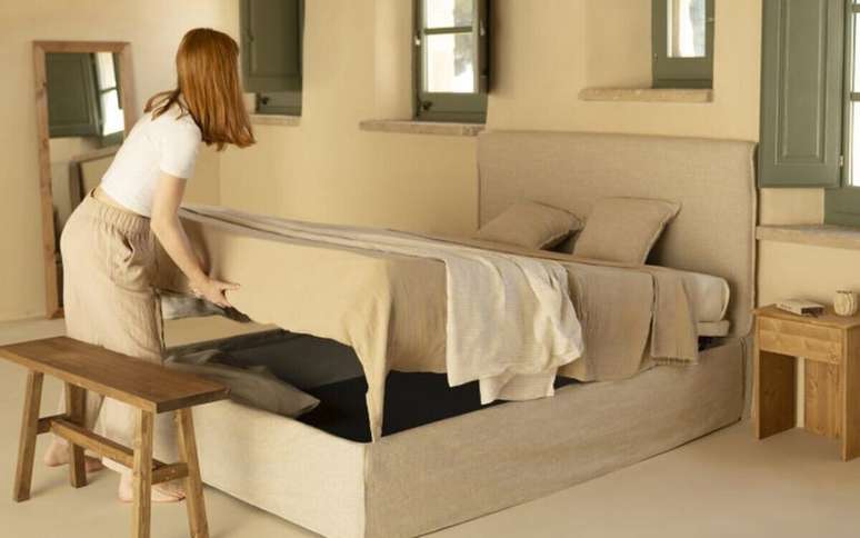 A aposta do momento são camas com bases estofadas ou de madeira aparente, levemente elevadas do chão. Esse detalhe simples já cria uma sensação imediata de organização e amplitude no ambiente. E o melhor: sem abrir mão do espaço extra para guardar objetos.
