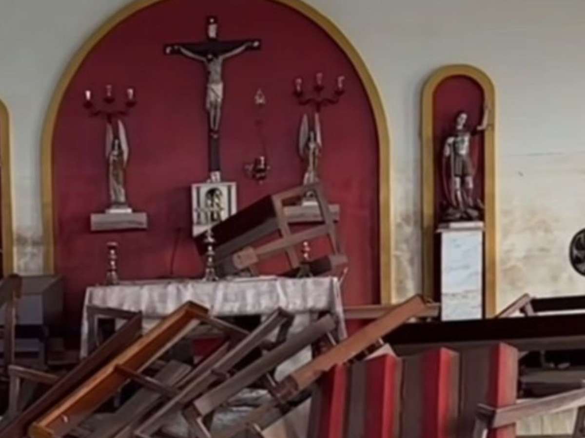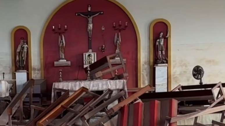Na capela, os bancos, que são muito mais pesados, foram revirados, mas o altar estava intacto segundo o vídeo; veja mais detalhes na matéria e confira o vídeo