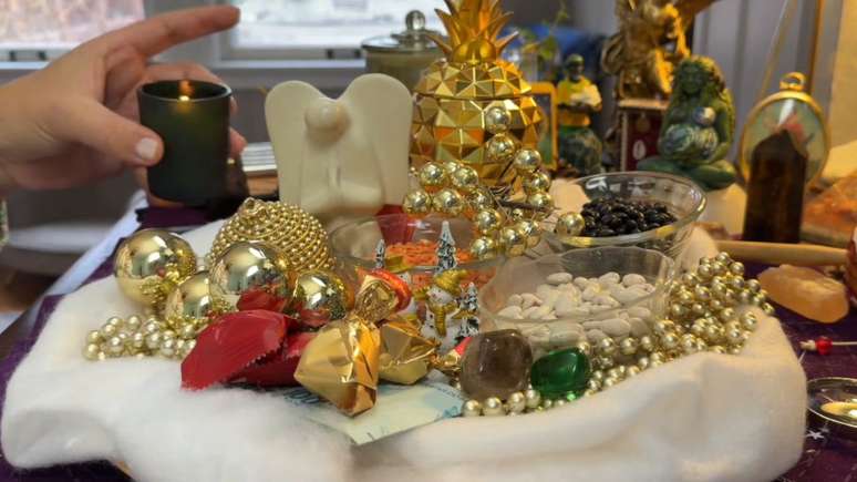 Depois, separe os grãos e os deixe ao lado do anjo. Com a caneta, faça uma linha no papel e divida-o em dois. Em um lado, escreva tudo que você deseja agradecer pelo que aconteceu no ano, já do outro, o que você deseja que se concretize em 2026. Por fim, coloque o papel no centro do altar e coloque os chocolates e o dinheiro em cima.