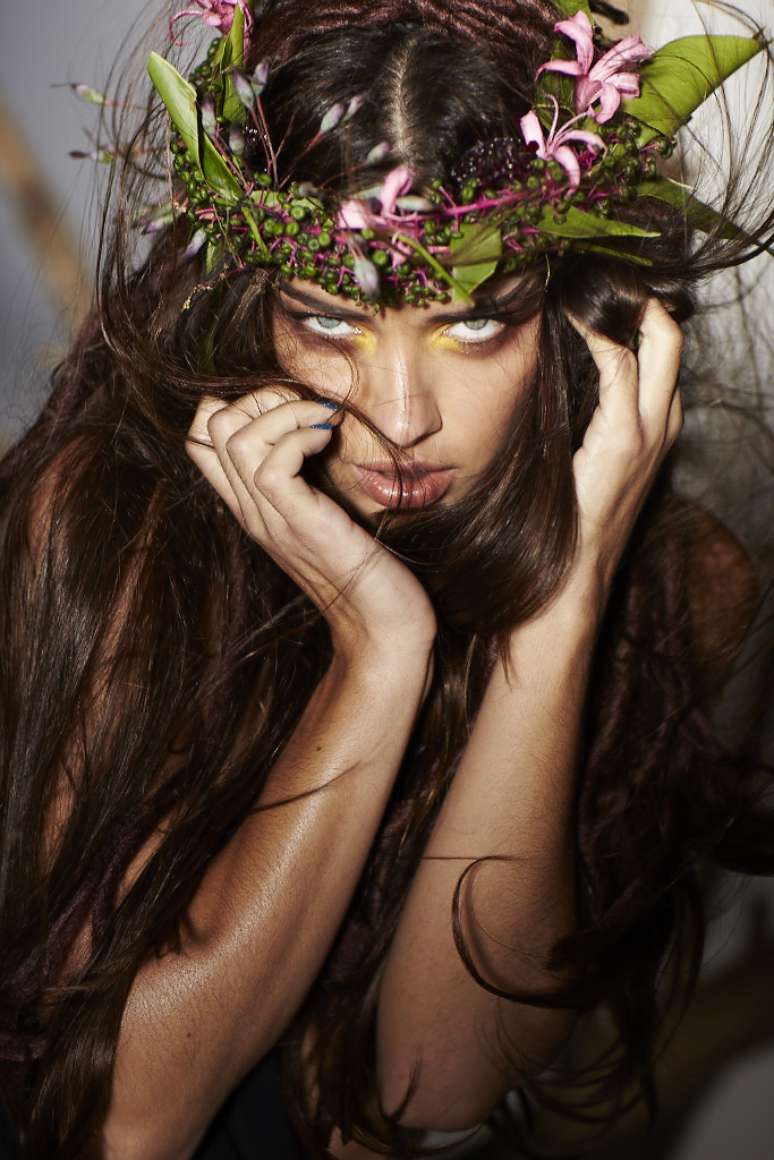 As modelos posaram com uma atitude naturalista e usaram flores e folhas na cabeça como parte do figurino para a campanha publicitária