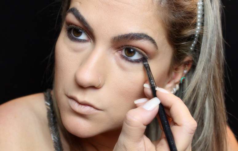 Aplique lápis preto para olhos por dentro e por fora da parte inferior dos olhos. Depois esfume com sombra marrom o lápis que foi passado por fora.