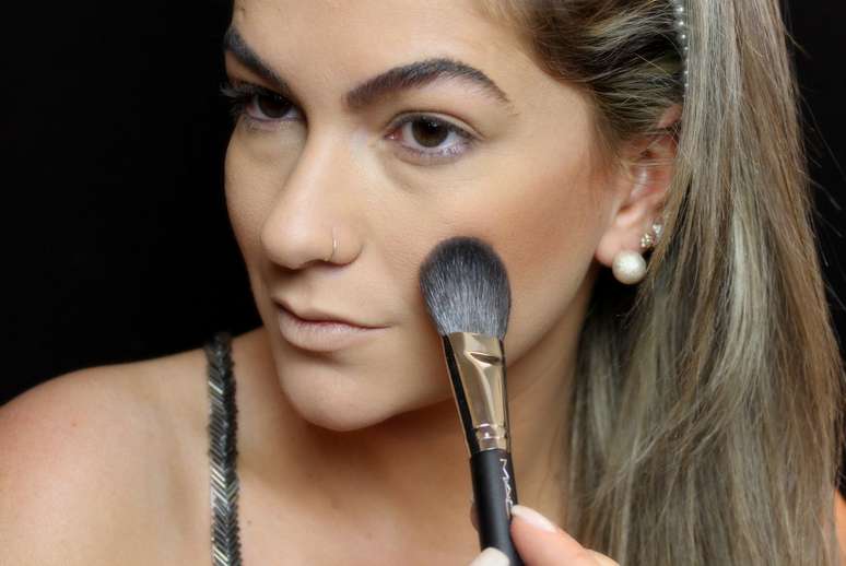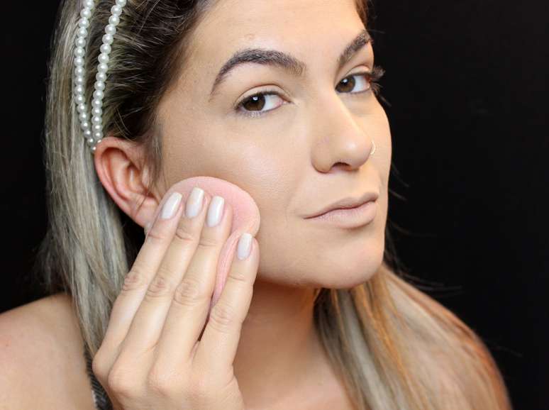 Como a maquiagem é para a praia, opte por um pó solto, que é bem mais levinho. Passe no rosto todo.