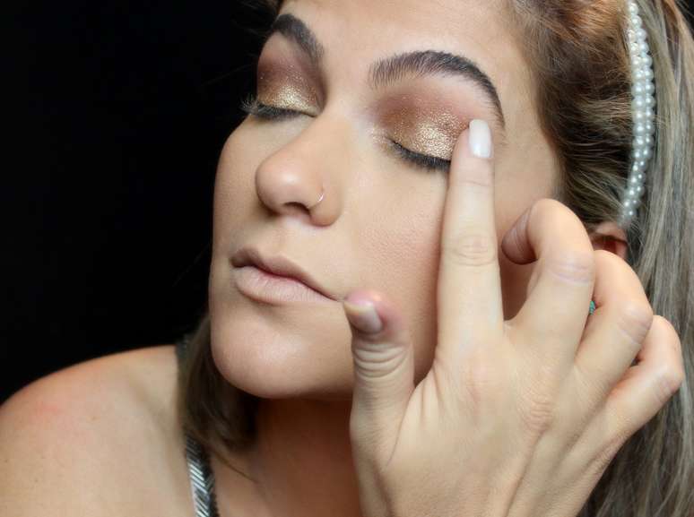 Nos lábios, opte por algo mais clarinho, pra deixar o look mais leve. Aplique batom líquido para durar a maquiagem dos lábios e, em seguida, gloss somente no centro dos lábios.