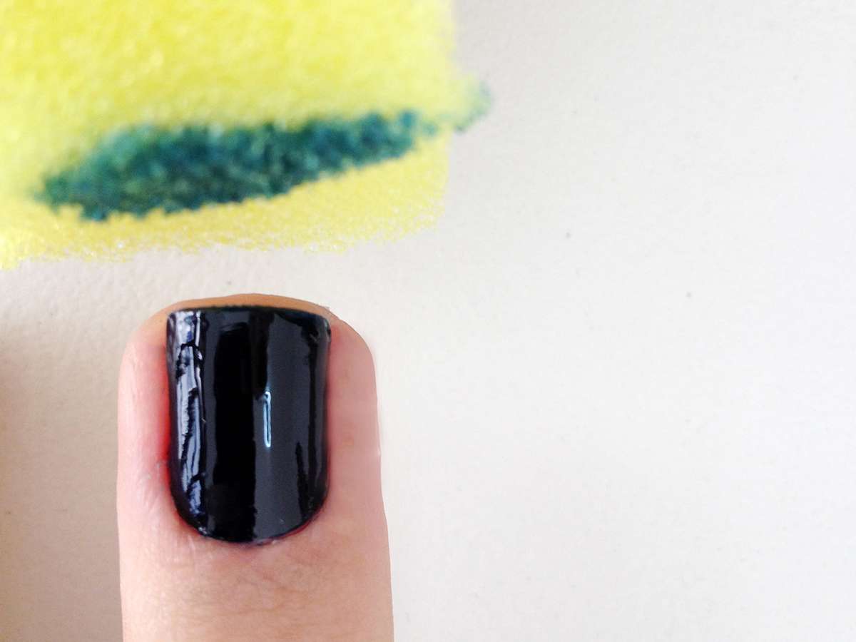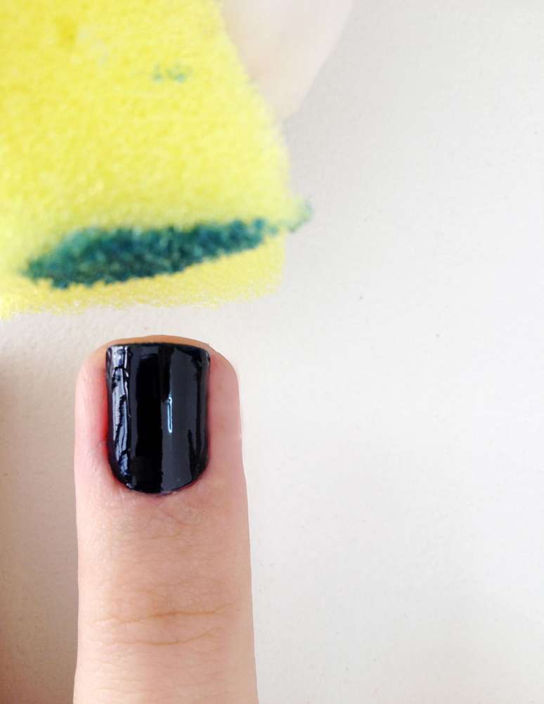 Depois de passar o esmalte, derrame em cima de uma superfície lisa ou de uma película de plástico um pouco do esmalte na cor escolhida para fazer o degradê. Neste caso, foi usado o verde esmeralda. Pegue uma esponja e pressione-a sob o esmalte