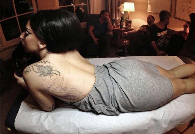A cantora Lady Gaga estava bem à vontade durante a sessão em que fez sua nova tatuagem. Deitada na maca, a musa pop postou em seu Instagram foto em que aparece com o vestido levantado mostrando que estava sem calcinha, mas de sapatos de salto alto.