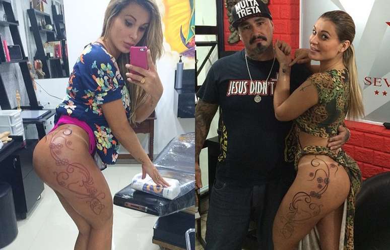 A ex-panicat Babi Rossi, que está no reality show A Fazenda 7, tem tatuagem que vai do bumbum até a lateral do tronco, feita em 2012.