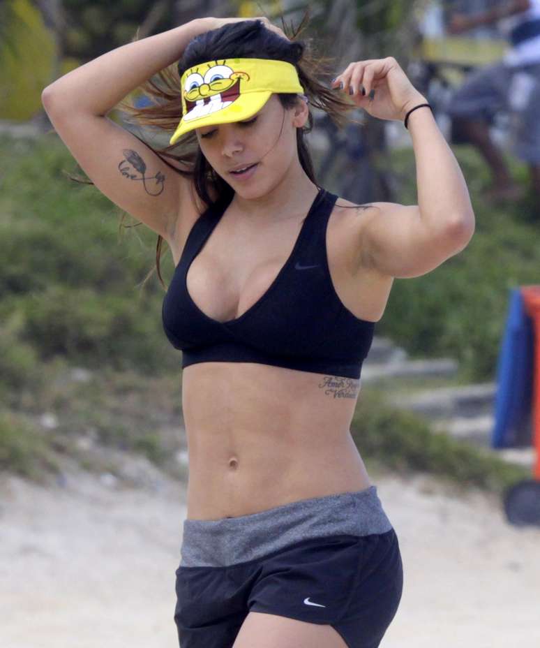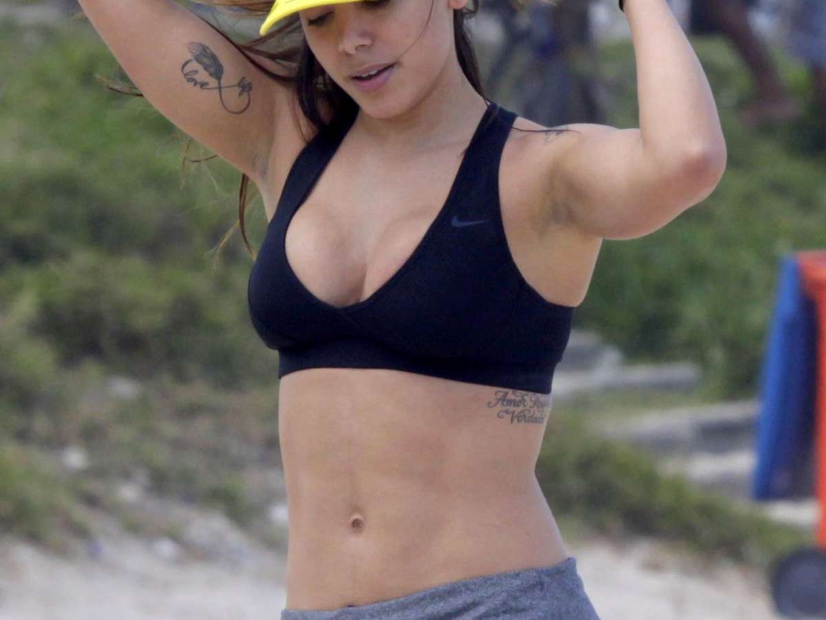 Anitta faz treino funcional na praia da Barra da Tijuca e não abre mão da viseira para afastar os fios do suor e o rosto do sol.