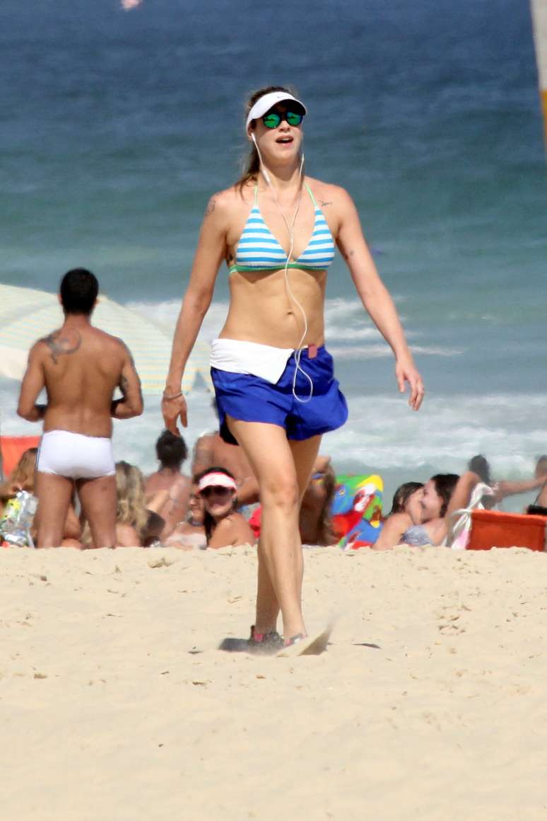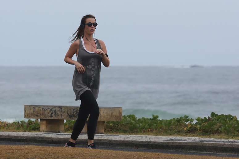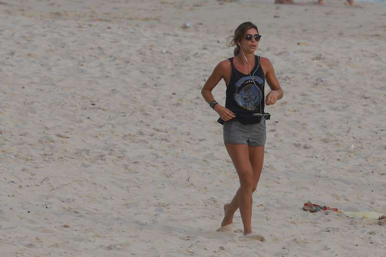 A atriz e apresentadora Grazi Massafera optou pelo rabo de cavalo baixo e frouxo para correr na praia da Barra da Tijuca.