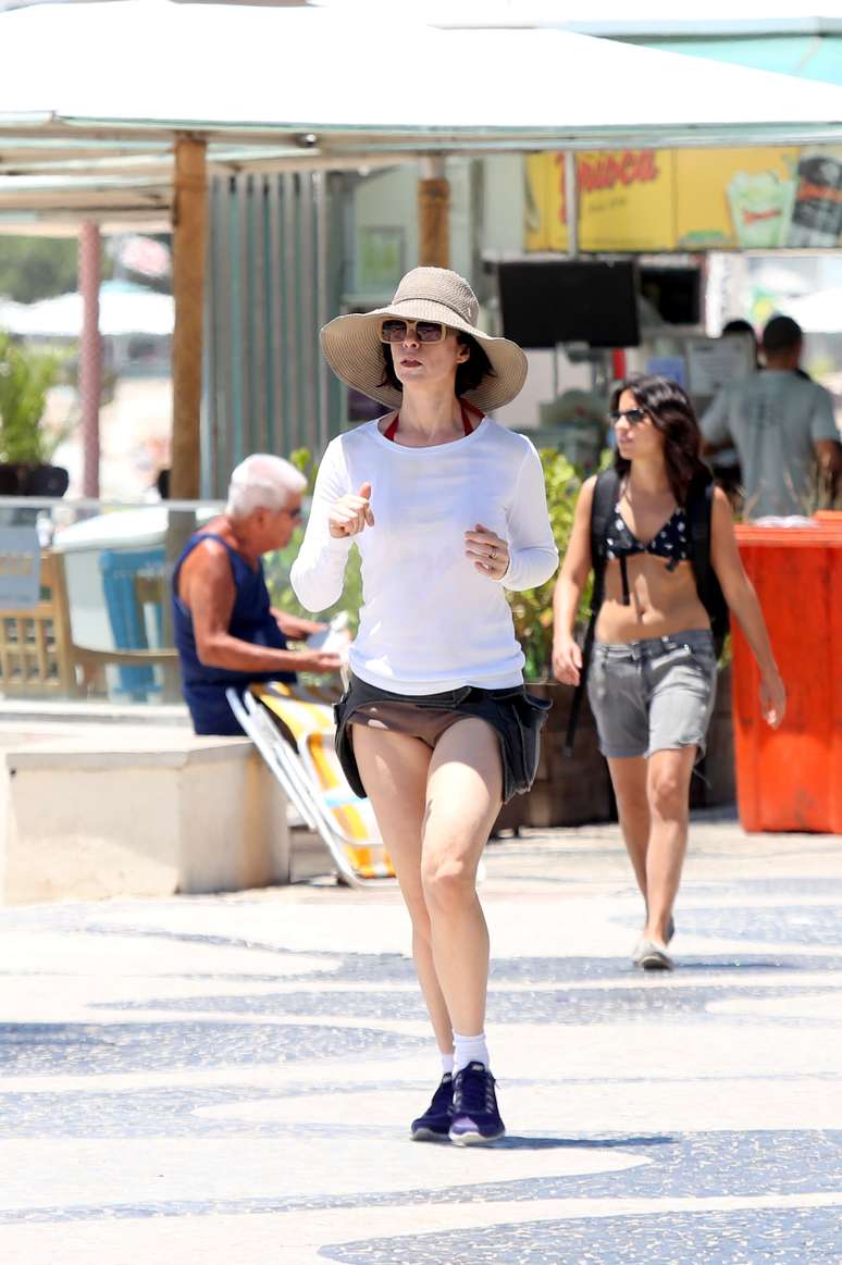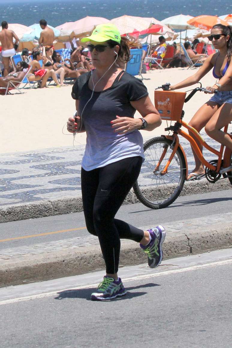 Preocupada com os efeitos do sol, a atriz Fernanda Torres aposta no chapelão para proteger o rosto e o cabelo na corrida na orla de Ipanema.