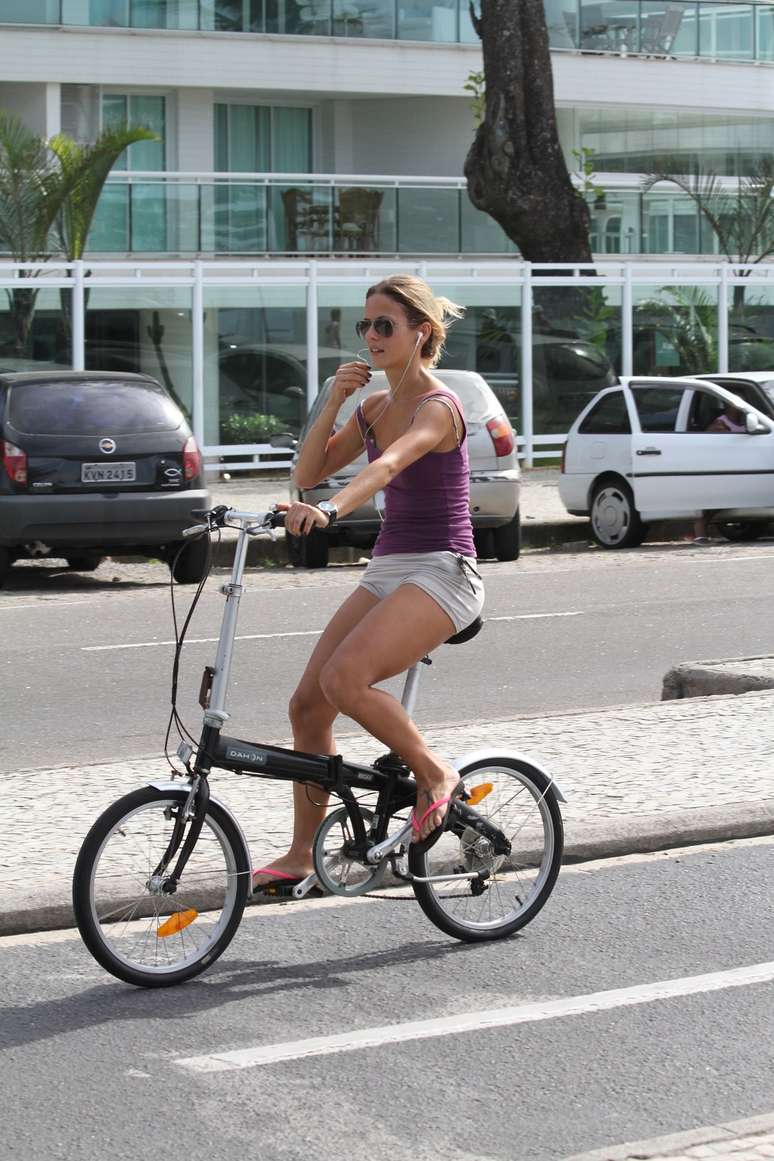 A atriz Fernanda Freitas, a Flavinha, de Tapas e Beijos, prendeu os fios em um coque para andar de bicicleta na Barra da Tijuca.