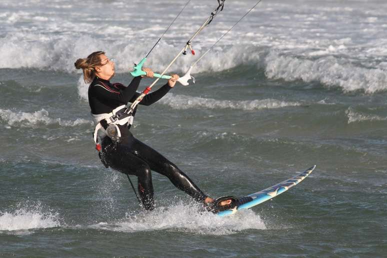 A jornalista e apresentadora Cristiane Dias prende os fios em um rabo de cavalo bem alto para praticar kite surf na Barra da Tijuca.