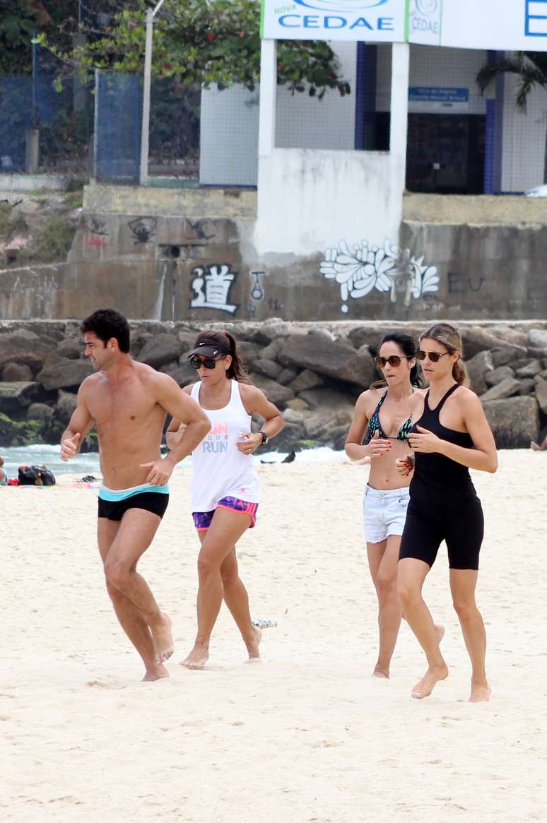 A apresentadora Fernanda Lima aposta no rabo de cavalo baixo parar correr na praia do Leblon.