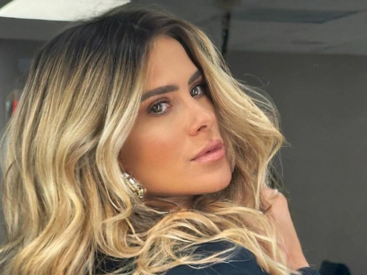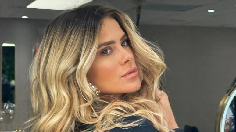 A atriz estava com os fios claros na altura dos ombros. Agora está com as madeixas mais volumosas e que vão até o meio das costas. Continua loira com a raiz mais escura.