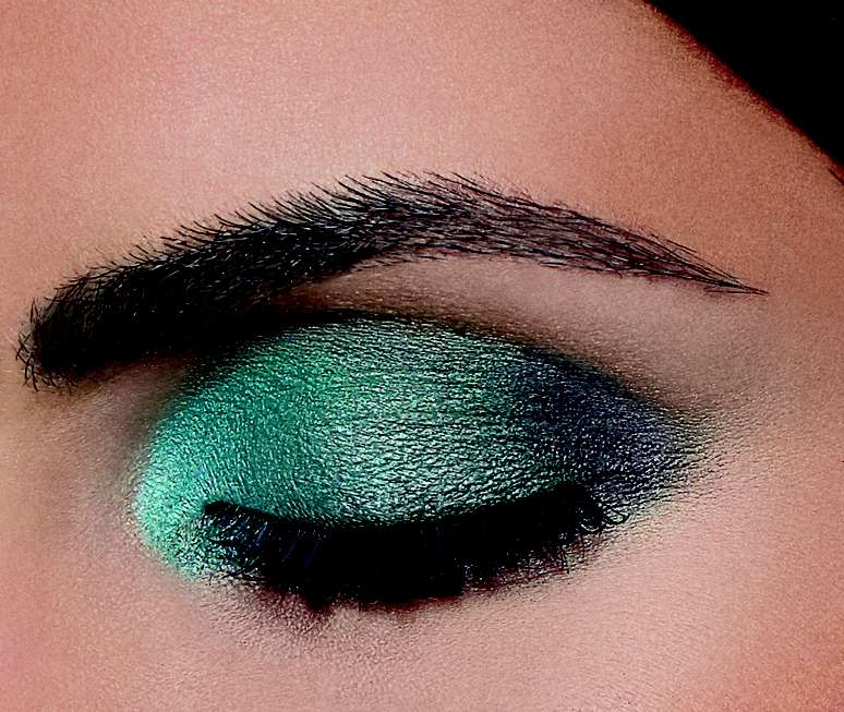 A primeira opção mistura verde e azul. De dentro para fora, aplique sombra azul na pálpebra móvel. Repita a operação com sombra verde, mas de fora para dentro. No canto externo do olho, esfume a sombra marrom por cima da verde. Passe sombra iluminadora abaixo das sobrancelhas