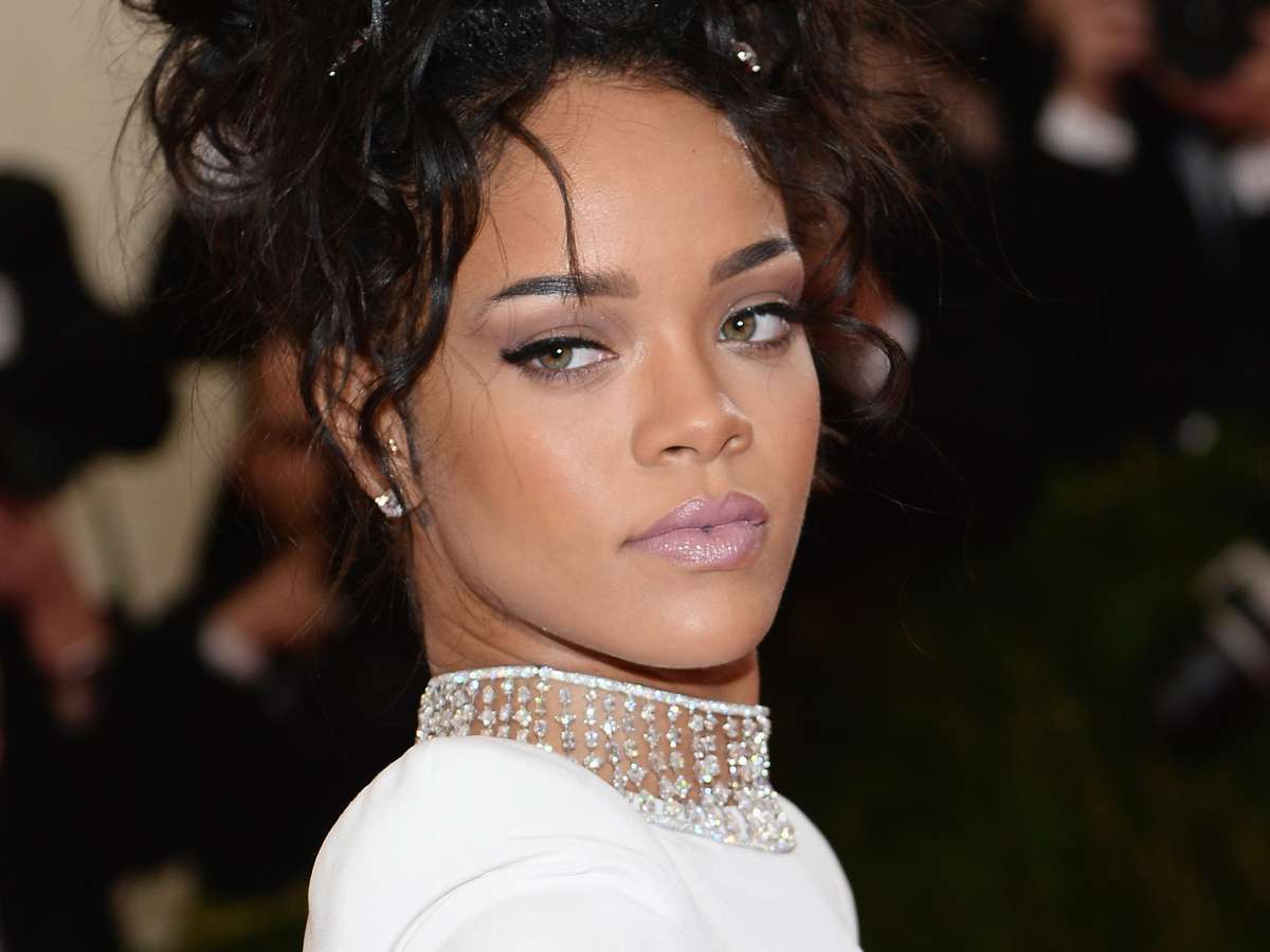 Rihanna - "Abusou do contorno para afinar o rosto e o nariz, investiu em cílios postiços no canto externo e na sobrancelha marcada. Antenada, apostou no batom lavanda para compor a produção", comenta o maquiador
