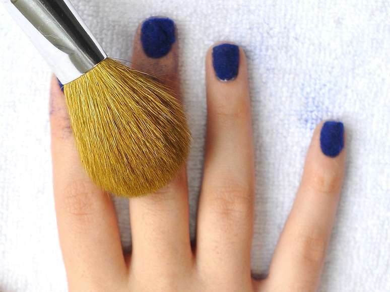 2. Passe duas camadas do esmalte azul biônico, da Colorama, e limpe as laterais com o algodão embebido em removedor enrolado no palito. Se você não tiver muita habilidade para retirar os excessos pode utilizar uma caneta removedora de esmalte. Depois, passe uma terceira demão fazendo uma esmaltação europeia, ou seja, sem encostar o esmalte na cutícula