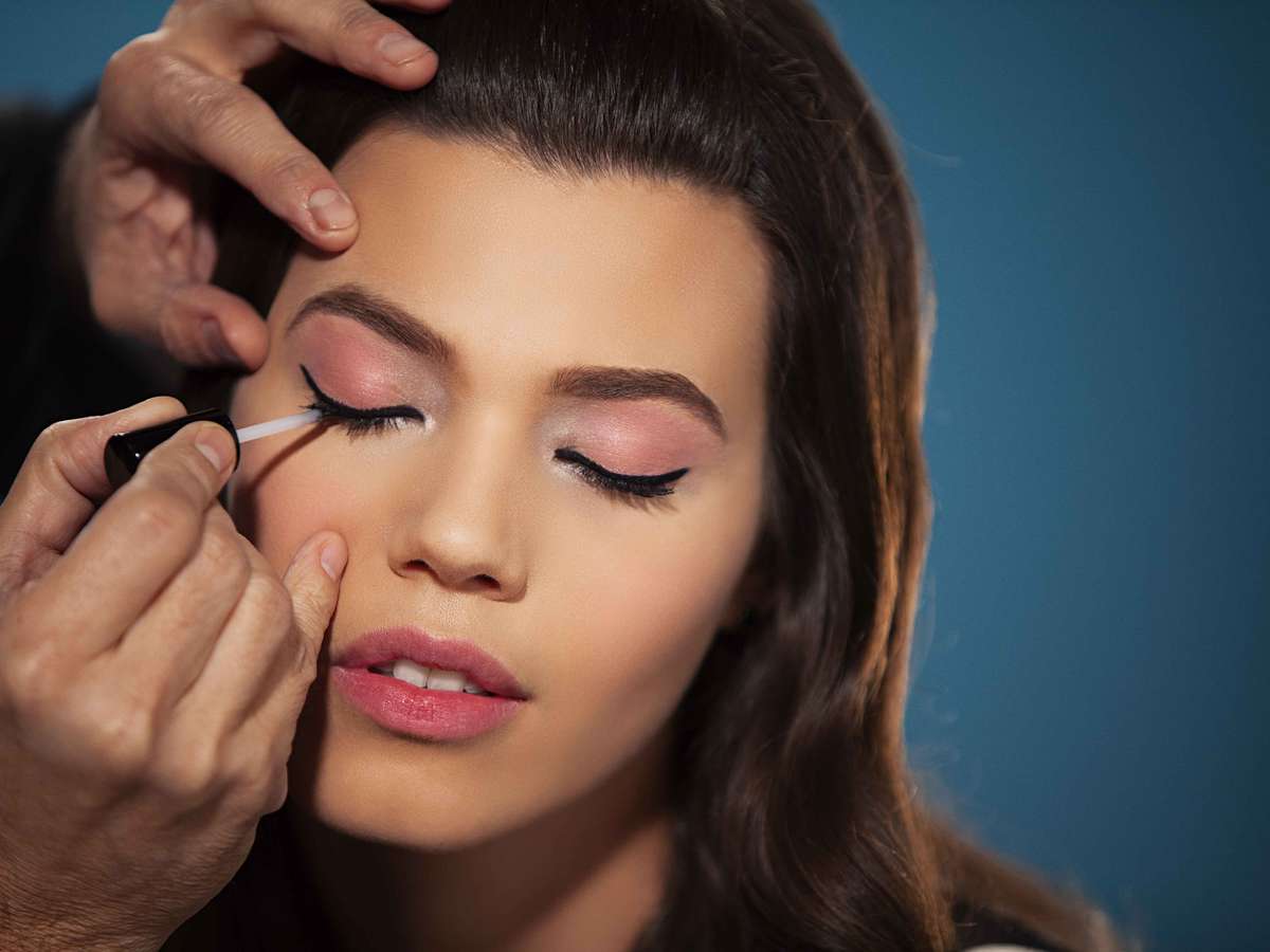 Na sequência, o maquiador aplicar sombra iluminadora do canto interno dos olhos para dentro, fazendo um canto de luz. Com essa mesma sombra, ele faz uma linha d'água do canto interno para o externo