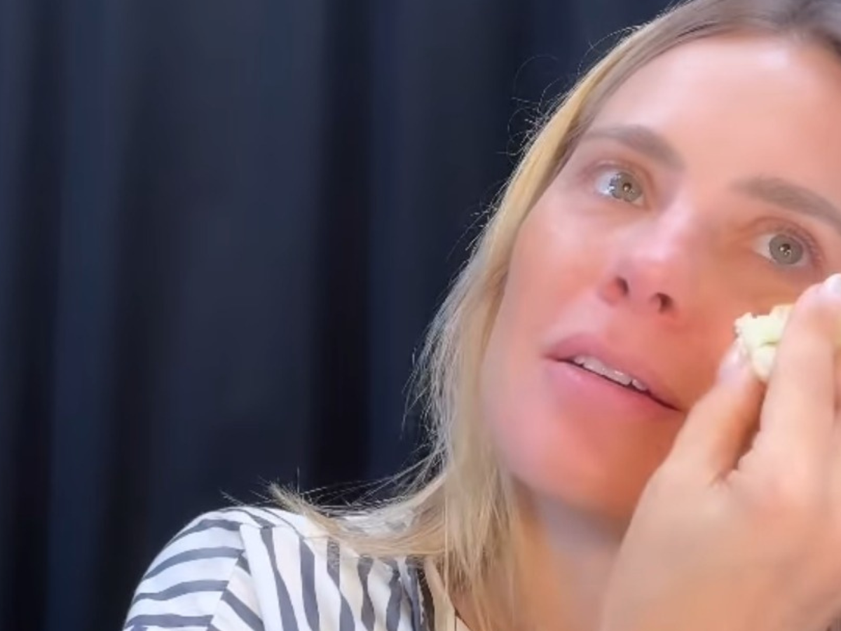 Ela pegou o alimento e encostou em uma paleta de maquiagem com tons amarronzados. Depois, como se fosse um carimbo, o pressionou levemente nas bochechas.