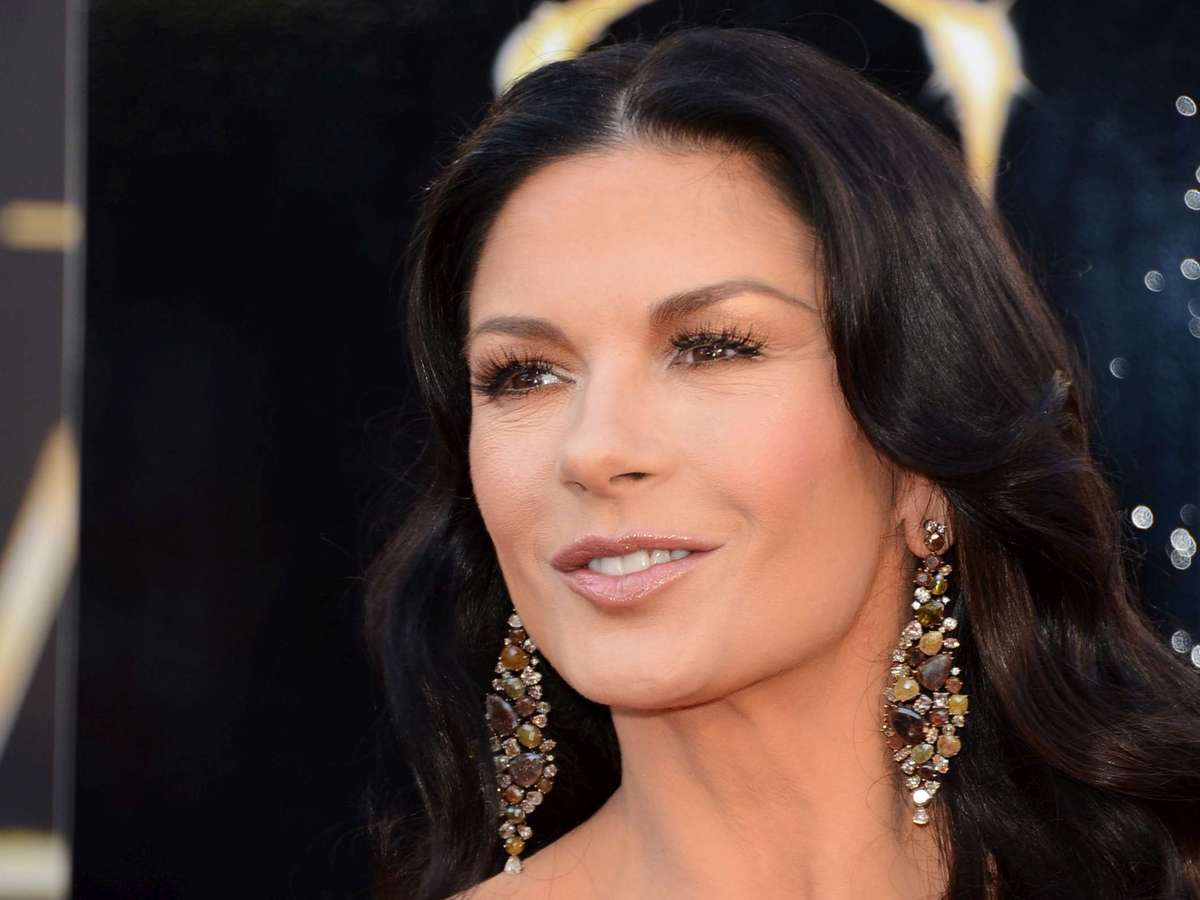 A atriz Catherine Zeta-Jones apostou na sombra dourada com brilho, aplicada suavemente nas pálpebras, para valorizar os cílios postiços