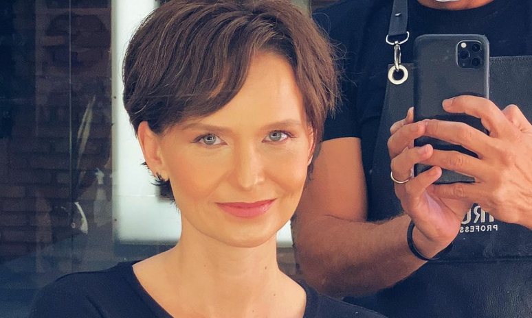 A atriz adotou o pixie, mais batidinho na nuca e com o restante dos fios repicados e assimétricos. A transformação radical de corte e cor, assinada por Anderson Couto, é para a personagem de um filme.
