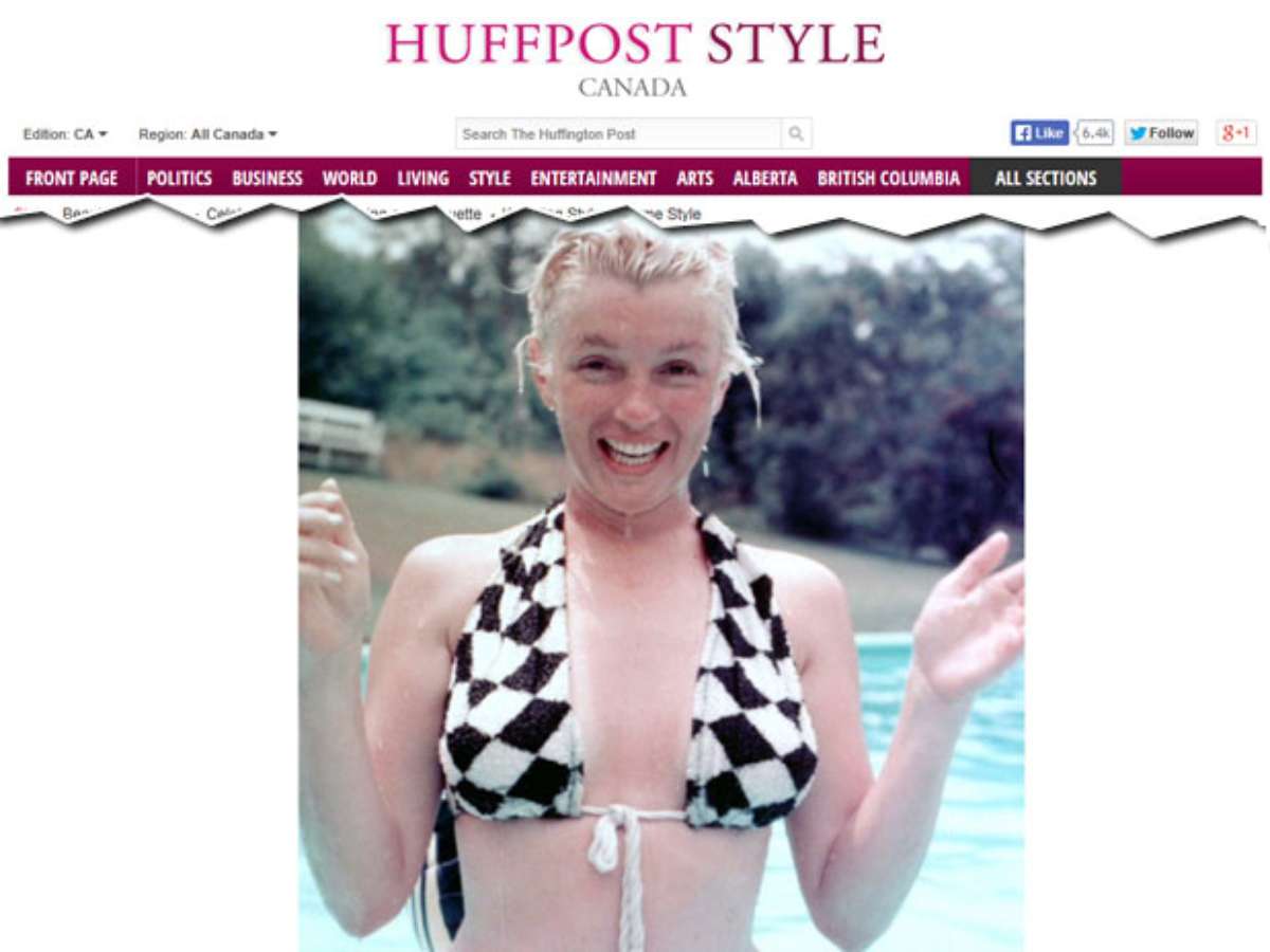 Foto que circula pela internet com Marilyn Monroe recém-saída da água, com biquíni de estampa geométrica