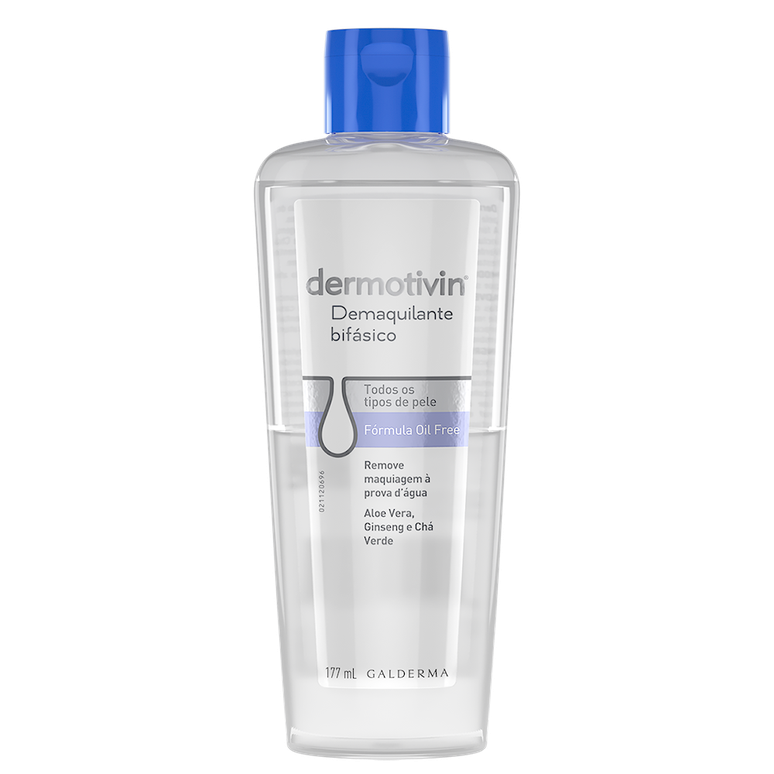 Dermotivin® Demaquilante Bifásico 177mlconta com estudos que indicam que 90,5% dos usuários perceberam remoção 100% da maquiagem. Com aloe vera, ginseng e extratos botânicos de chá verde, o demaquilante possui umafórmula bifásica e sem oléo que remove a maquiagem resistente deixando uma sensação de pele hidratada. Além disso, não obstrui os poros e remove eficazmente todos os tipos de maquiagem, até mesmo rímel à prova d'água.